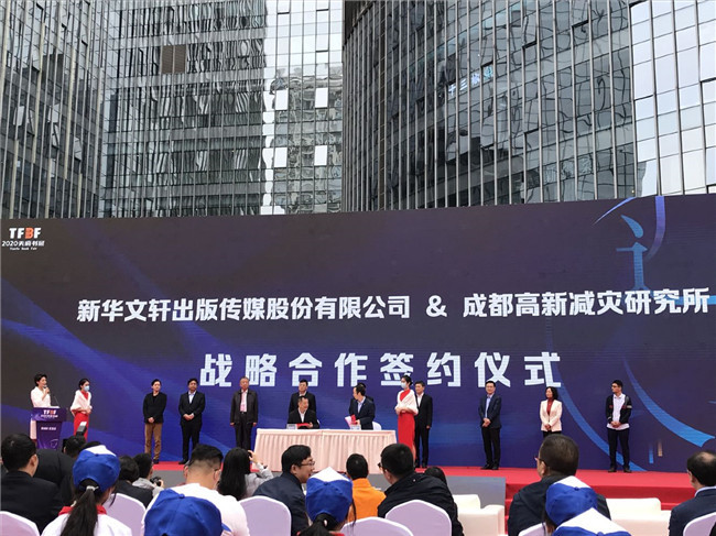 10月17日上午,在2020天府书展现场,新华文轩出版传媒股份有限公司与北京华智创视科技有限责任公司、深圳市大疆百旺科技有限公司、成都高新减灾研究所、四川师范大学四家单位签定战略合作协议。