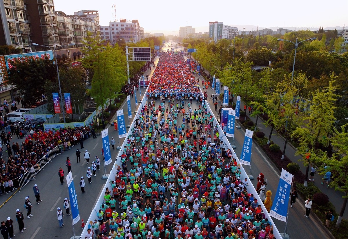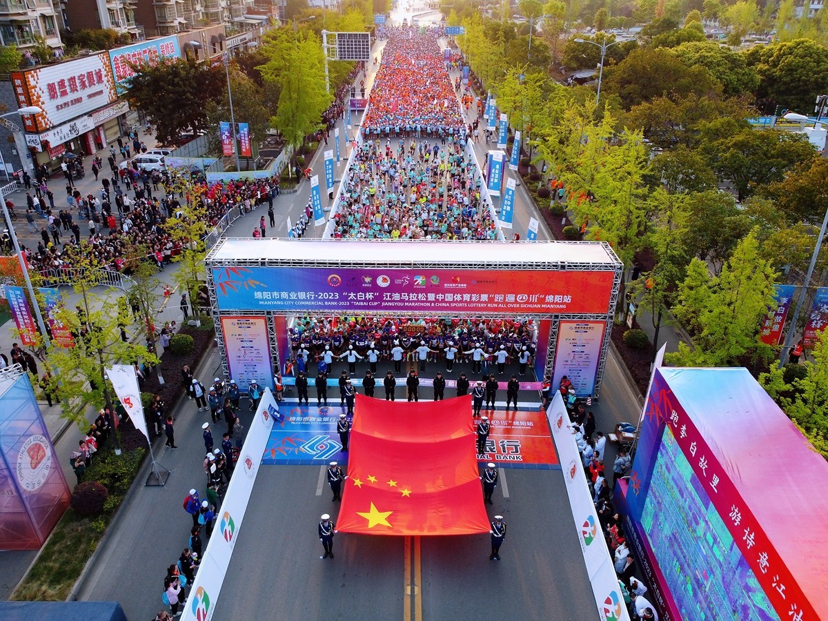 4月9日,绵阳市商业银行·2023“太白杯”江油马拉松暨中国体育彩票“跑遍四川”绵阳站在江油市体育中心鸣枪开跑,来自国内外的8000余名专业选手、马拉松爱好者参赛。