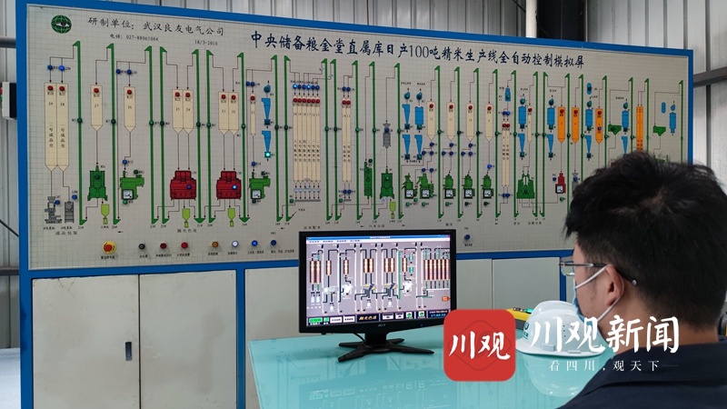 中储粮金堂直属库日产100吨精米生产线全自动控制模拟屏,该控制系统可以控制监测从收购来的稻谷到筛选生产出精米的全过程