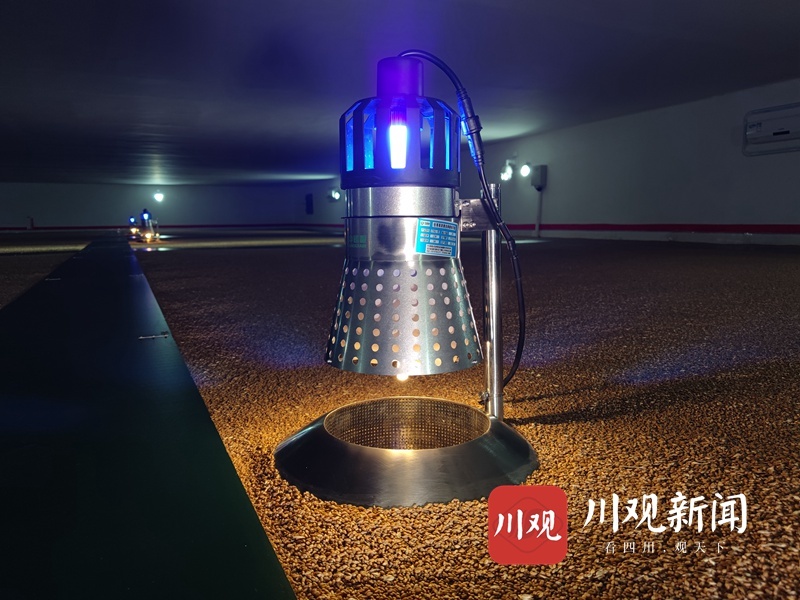 成都中储粮储备有限公司粮仓内部,诱虫捕杀灯正在工作,它能有效治理粮食储存期间的虫害问题,保障粮食安全卫生。