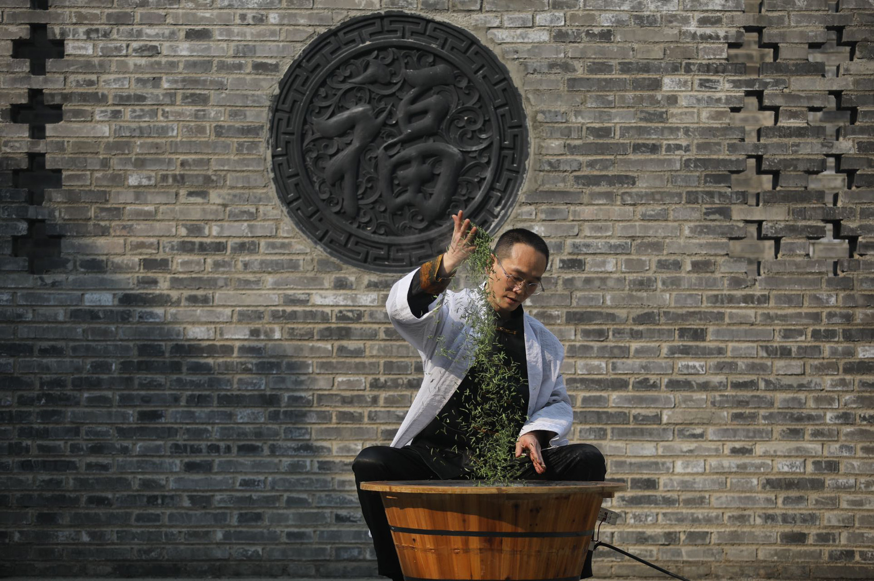 成都茶馆文化(成都铜壶茶艺)传承人、高级茶艺师曾小龙展示茶艺。 李婷摄