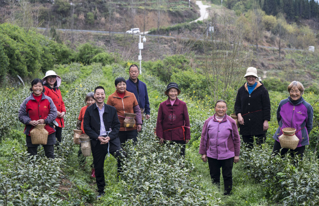 青川县沙州镇青坪村村民在白茶基地中合影。摘鲜叶,当地茶农每天能挣200多元。白茶已成为当地的富民产业。何海洋 摄