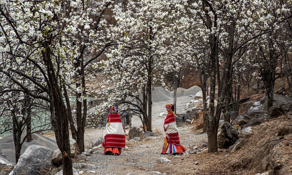 随同无数赏花人的脚步,我慢慢穿行河谷。越来越多的梨树梨花,是根植这块雪域高地的精神象征,也是让我怦然心动的一抹亮色。视线可及的远山,白雪皑皑,山顶积雪,化作小溪流水,漫漶成了一幅天然的高原水墨画。