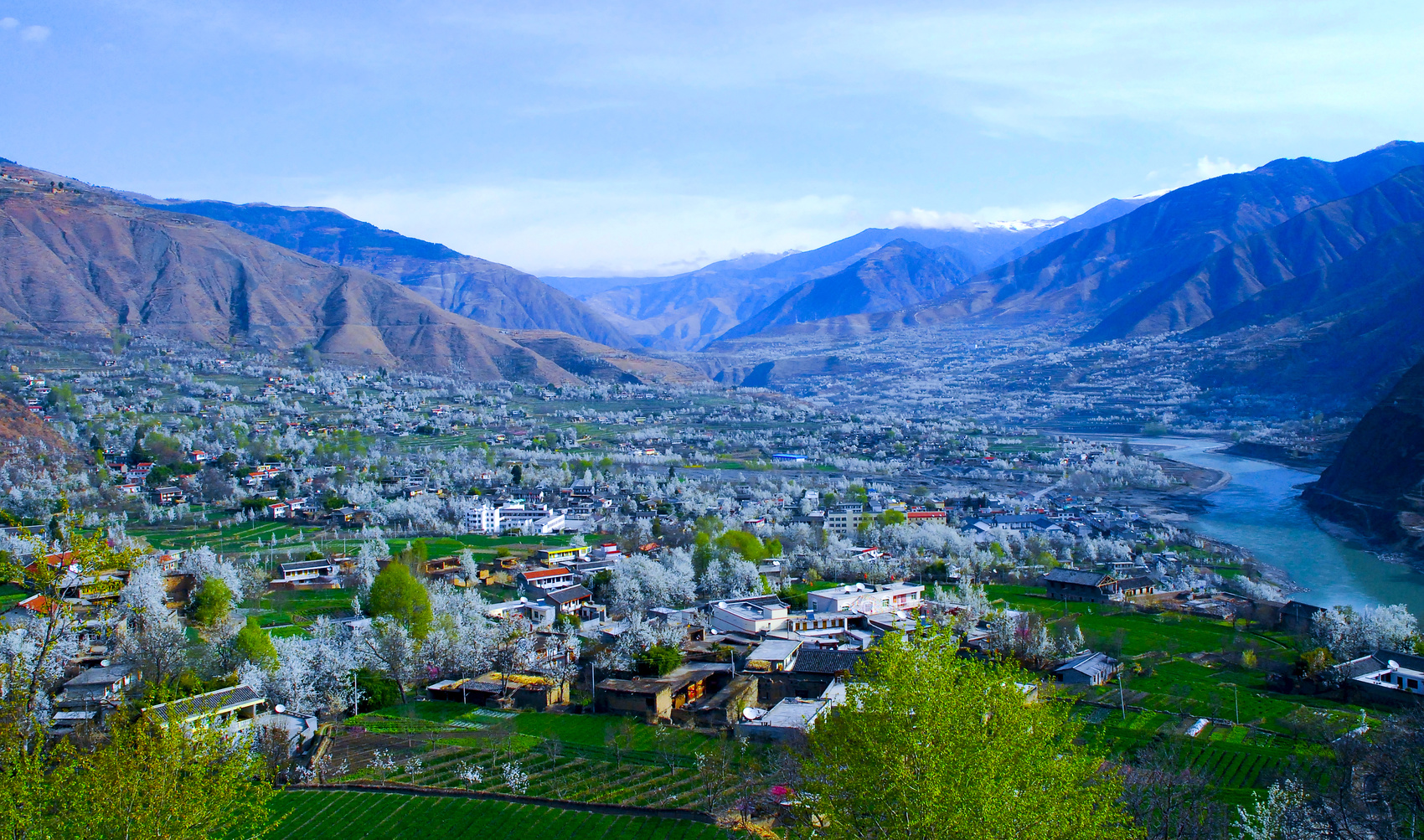 当雪域高原还在冬的怀抱沉睡时,大金川河岸的梨花,已经竞相盛放。山上积雪,河谷梨花,相映皆洁白。雪是梨花的背景,梨花又是雪的点缀,“冬春相逢”“梨雪映白”的自然景观,也就走进了现实,闯入了我们的生活。