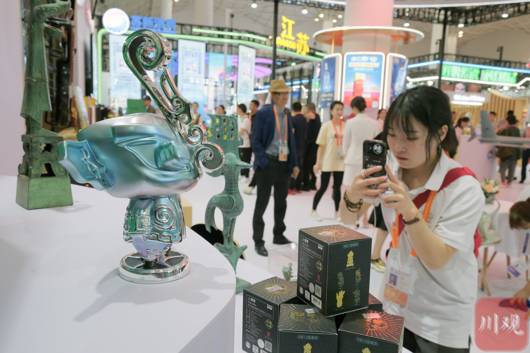 广汉市三星堆文旅发展有限公司产品经理廖鹤洋介绍,与以往展出的展品不同,此次亮相消博会的产品大多都是刚上市的文创产品,更加突出潮流、潮玩、家居实用等特点。“有的是3月31日首次且只在线上发布的新品,有的是当下最受年轻人欢迎的爆款,希望能通过消博会的平台,把三星堆文化进一步推向国际市场,转化成实实在在的有竞争力的特色消费品。”廖鹤洋说。