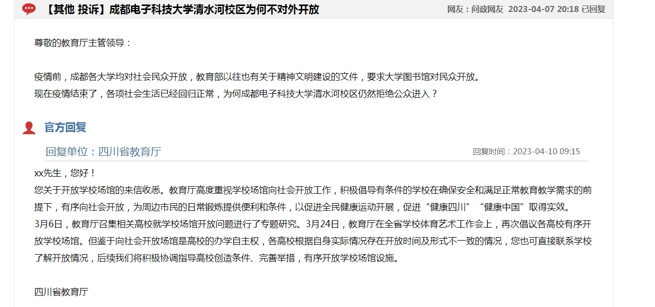 4月10日,四川省教育厅公开回复:教育厅积极倡导有条件的学校在确保安全和满足正常教育教学需求的前提下,有序向社会开放,为周边市民的日常锻炼提供便利和条件,以促进全民健康运动开展,促进“健康四川”“健康中国”取得实效。