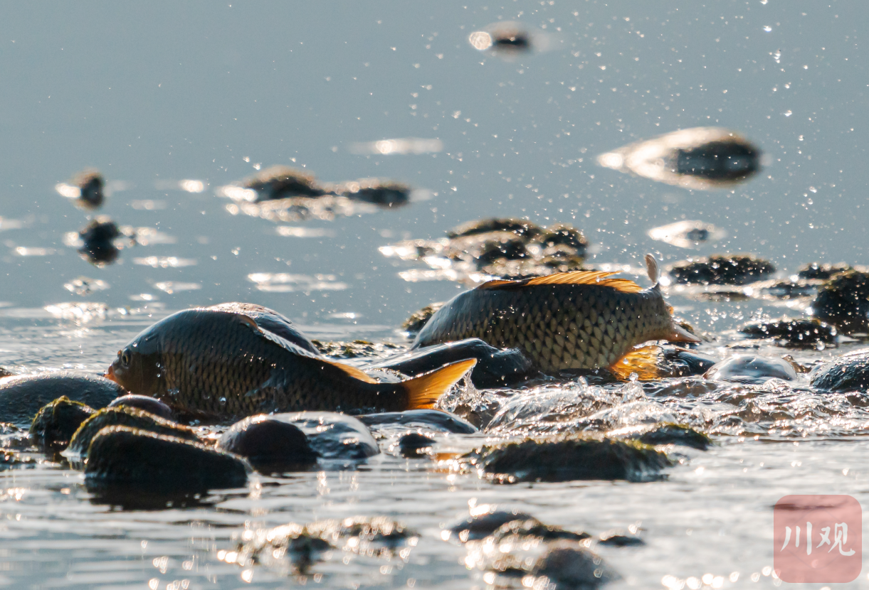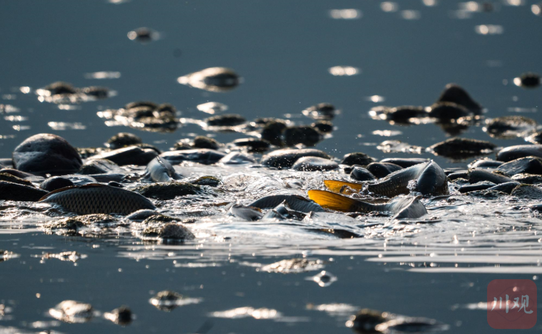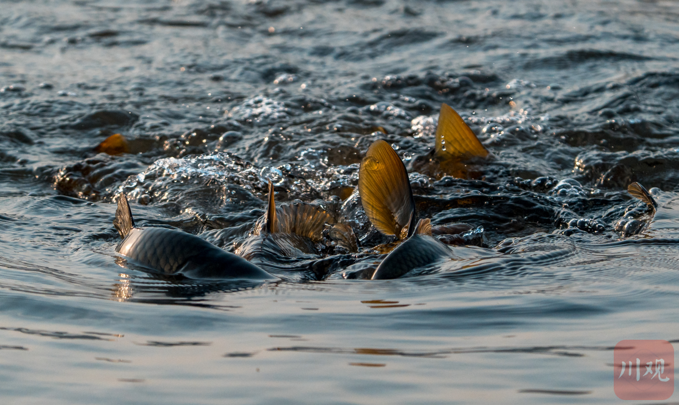 4月11日清晨,泸州市江阳区滨江路长江边的浅水区,成群结队的鲤鱼跃出水面,激起阵阵水花。“看,好多鲤鱼在‘板籽’(产卵),” 围观的市民无不为眼前的壮观景象称奇,“好多年来,长江边都没这样的场景了”。