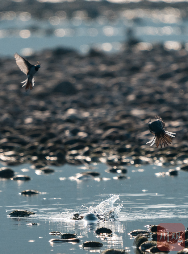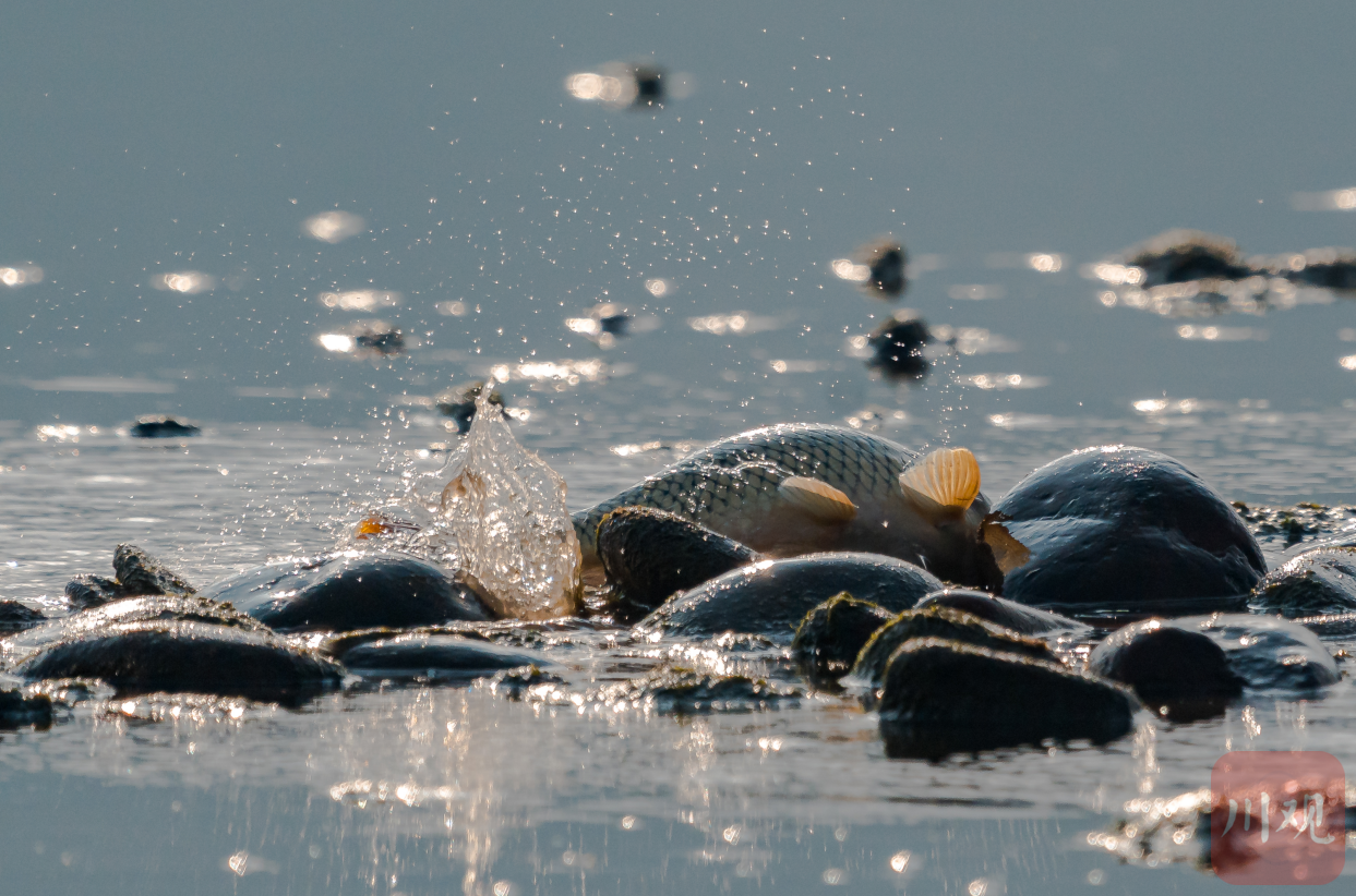鲤鱼群在浅滩的鹅卵石上产卵,水花惊动了飞行的小鸟