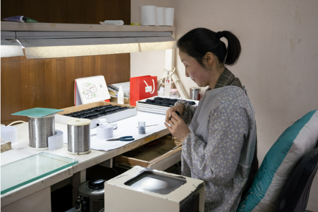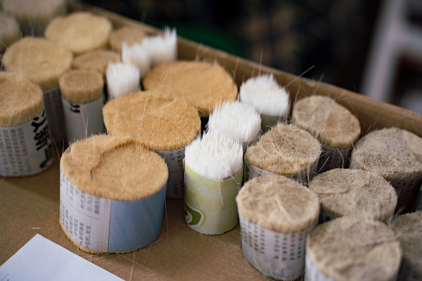 “一把化妆刷主要由刷毛头、金属口管和刷杆三部分组成。这中间,最为重要的刷毛头制作工艺看似简单,实际上却有很多外行难以跨越的门槛。”1997年8月就加入晃佑堂的江敏如此说道。此时,在江敏手上一把毛束正被一遍遍翻转、梳理,随后就变成整齐的毛头。再经过一系列的工序后,这些经过加工的刷毛头将会搭乘飞机,漂洋过海,运送到下一个生产线上。
