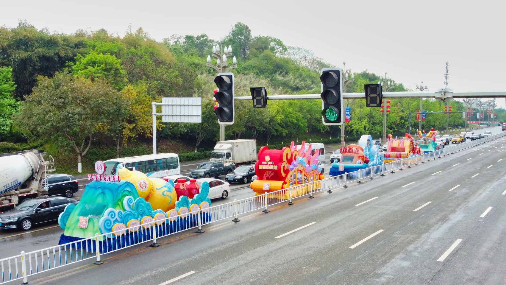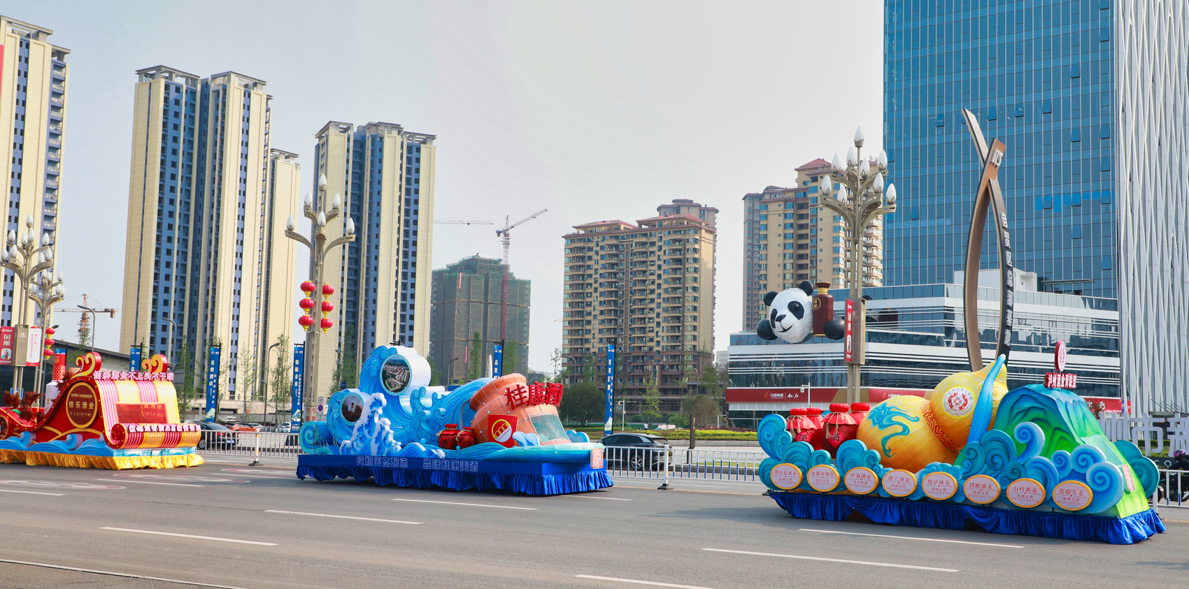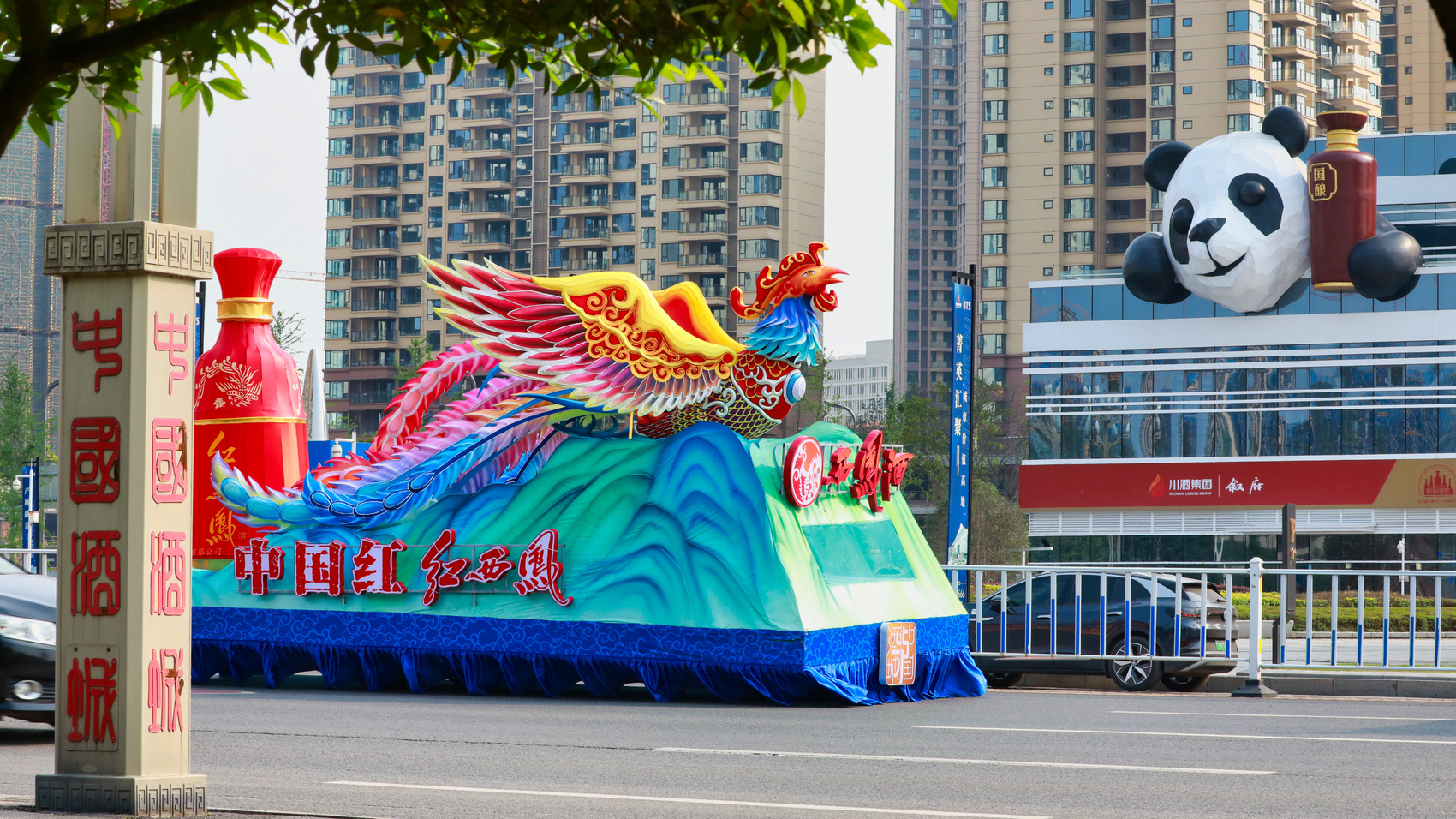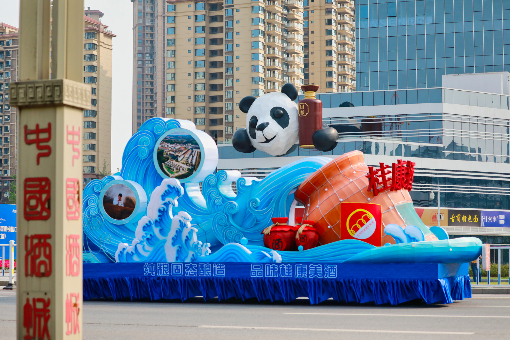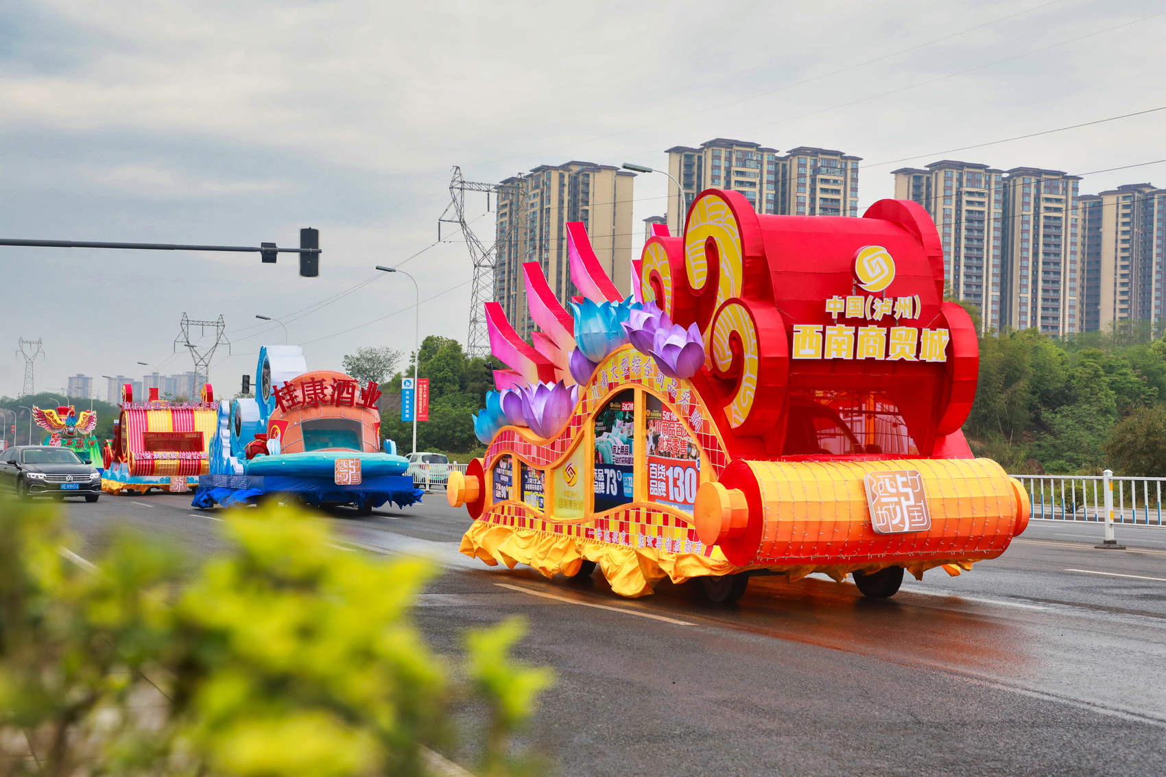 4月12日,在泸州西南商贸城五区门口,五辆“酒”主题花车停靠在路边,酒坛、酒瓶、酒葫芦、酿酒高粱等与酒相关的元素,使得花车造型精美新颖、极具视觉冲击力,可谓一车一故事,一车一风景。