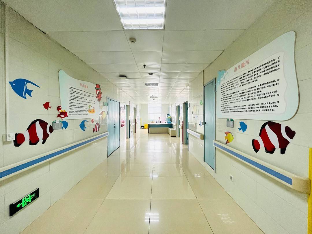 医院6楼是2018年12月成立的儿科病区,有25张床位,最近几个月基本处于“满员”状态。以浅蓝色为主调,配上各类海洋卡通动物墙绘的装修风格,营造出儿科病区独有的温馨可爱氛围,仿佛进入了“海底世界”,有效缓解了患儿入院的紧张情绪。