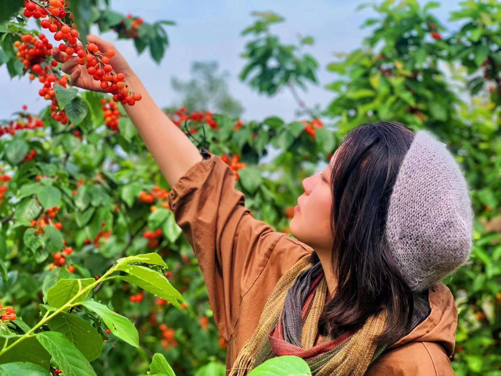 游客采摘樱桃。