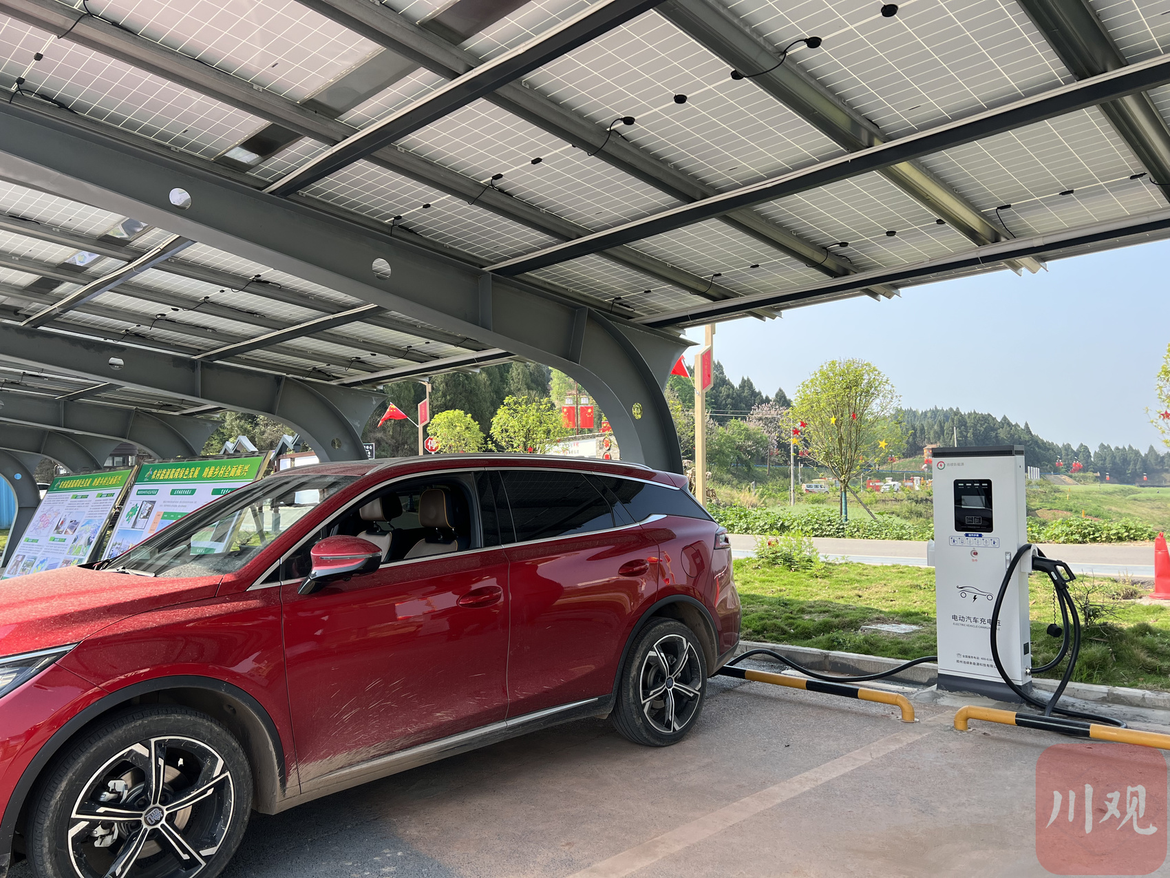 除了地底的热能,天上的太阳能也被纳入了海龙村的减碳计划。安居区平均日照时数长,光热资源丰富,在海龙村村口,十多个光伏发电充电桩已经投放,方便村民和来往车辆使用。村里的光伏发电年平均发电量8.67万度,70%并入国家电网,30%用于新能源车充电。