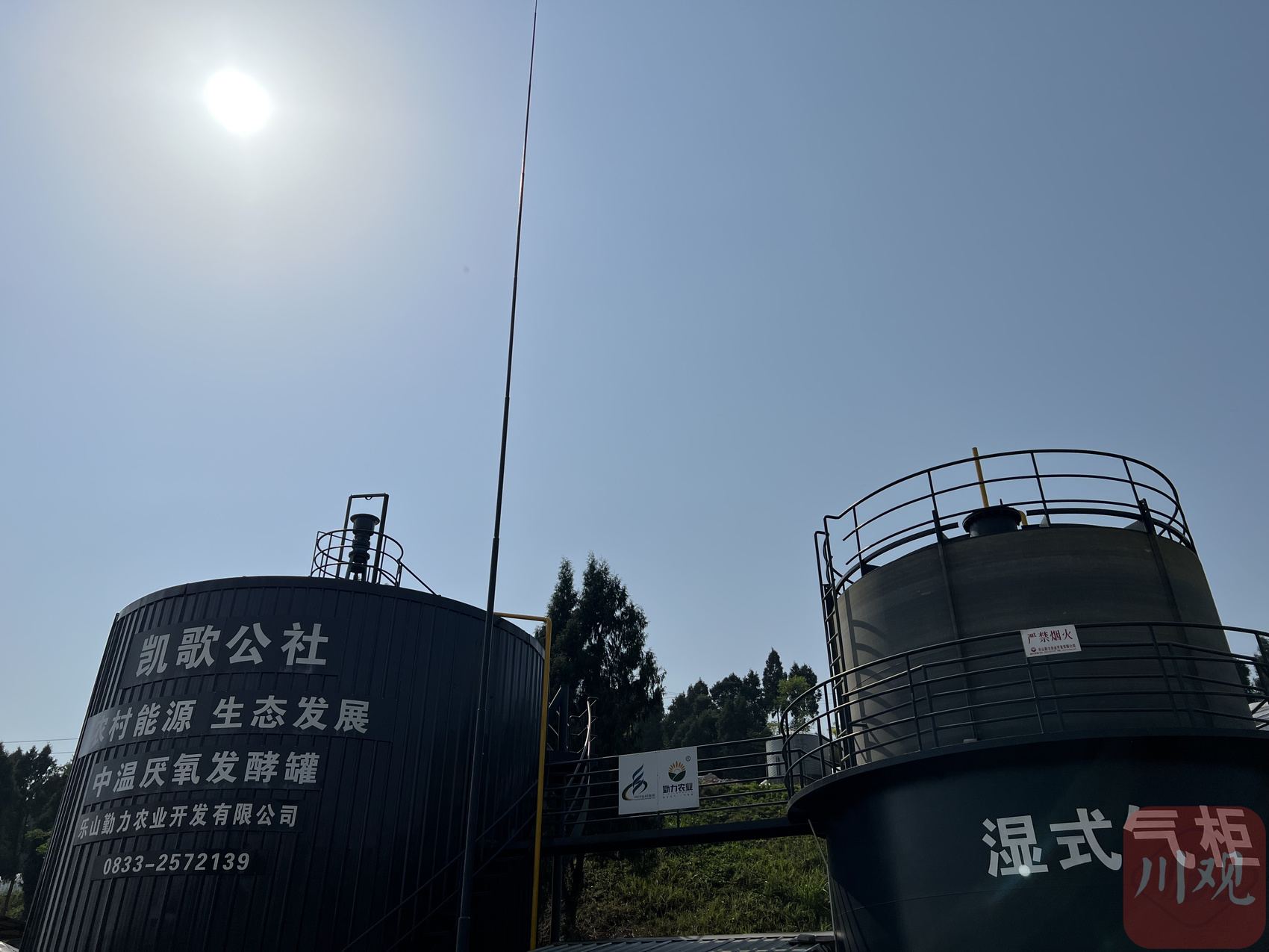 一座建设在半山腰上的中温厌氧发酵罐,是海龙村的标志性建筑。发酵罐里储存的是附近一家生猪养殖场产生的粪污,发酵系统利用粪污产生沼气、沼渣、沼液。