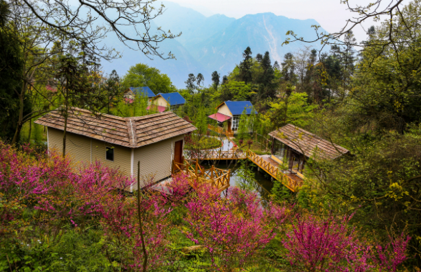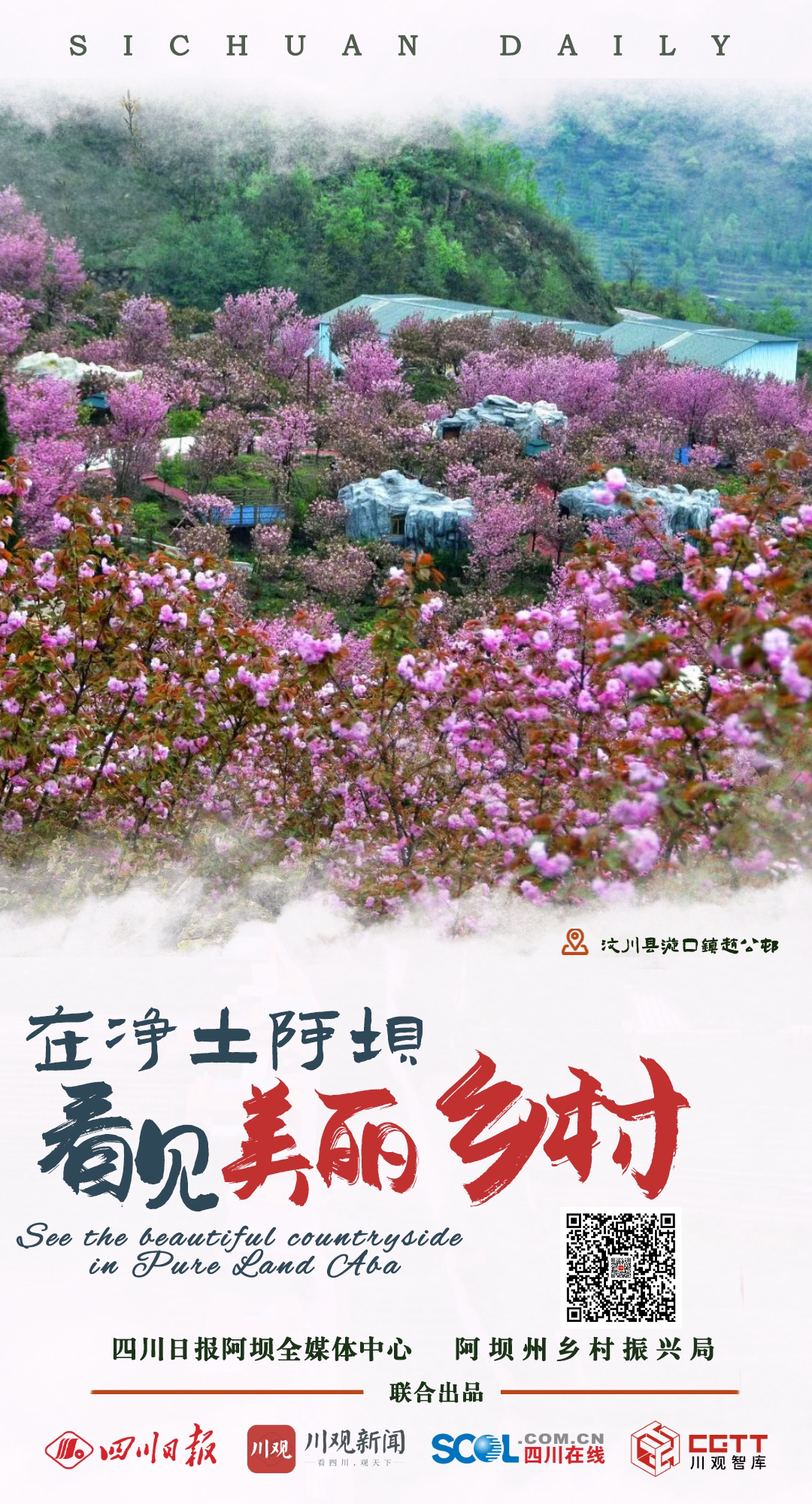 山峦连绵起伏,山间溪流淙淙,民居炊烟袅袅,在云雾缭绕和樱花盛开之间,赵公村这个东邻都江堰、南接紫坪铺水库的多民族村落风景如画。