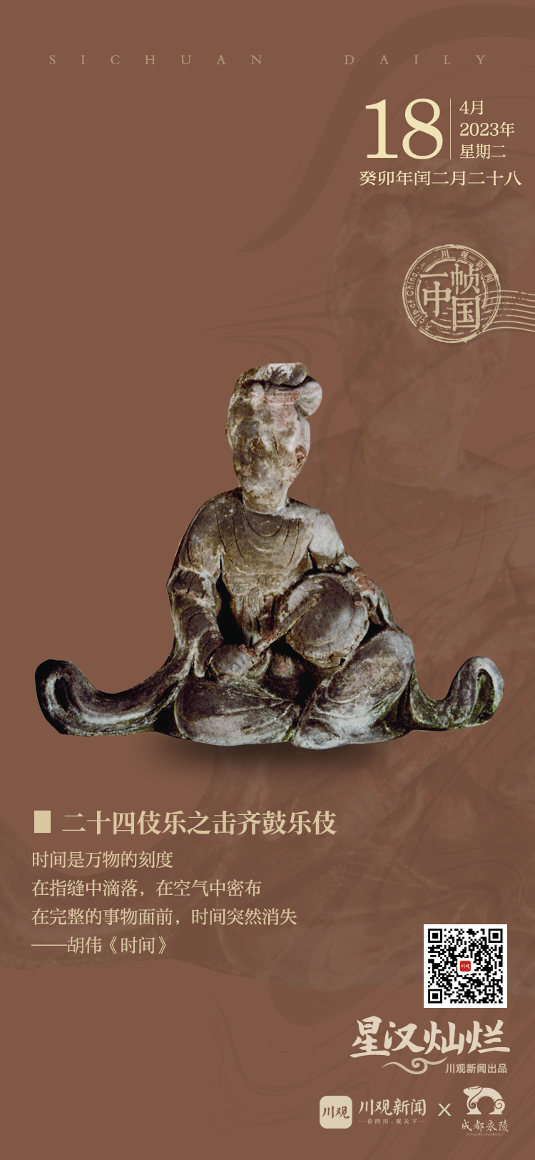 二十四伎乐中的击齐鼓乐伎位于永陵棺床东侧前段。乐伎左手扶鼓腰置于盘曲的左腿上,右手执杖击打鼓面。透过浮雕,我们能看到齐鼓鼓面的凸起,也能感受到乐伎敲打时的节奏感。
