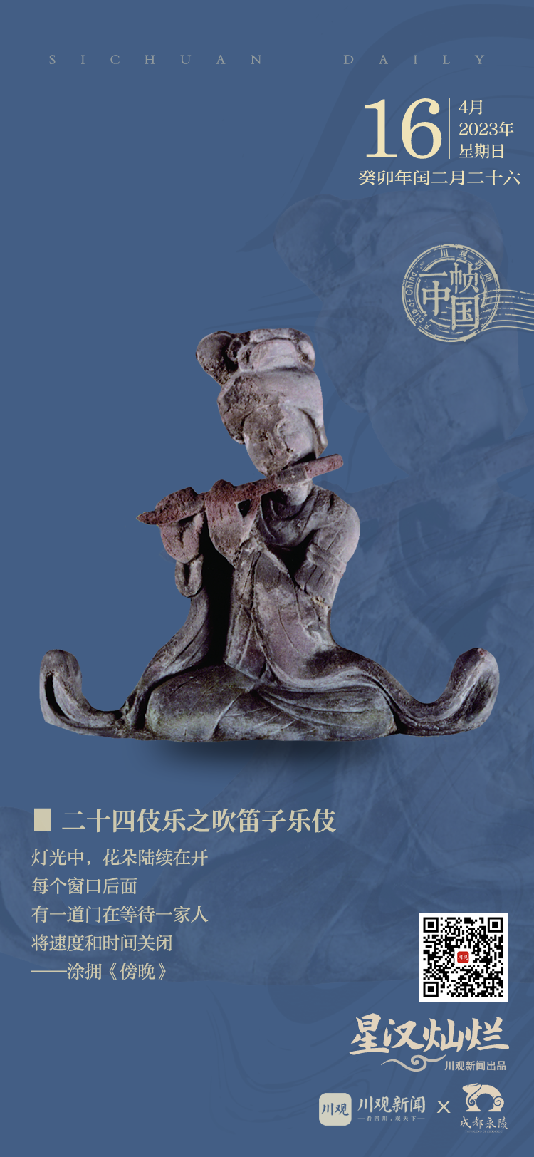 二十四伎乐中的吹笛子乐伎位于永陵棺床东侧前段。乐伎双眼微垂,双手横执笛管,抬臂于右肩前,右手指正按笛管尾端音孔,左手指反按笛管中段音孔,嘴角内凹,舌尖微露,双唇略离开笛管吹孔,仿佛吹奏过程中的换气停顿,人物表情极为生动。