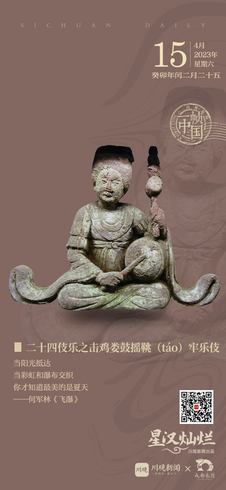 唐代乐队演奏时,通常由一人同时演奏鞉牢和鸡娄鼓两种乐器,二十四伎乐中的击鸡娄鼓摇鞉牢乐伎就很生动地反映了这种演奏方式。该乐伎位于永陵棺床东侧后段,其左手执鞉牢举于头部左侧摇拨,右手持杖击打挟于左腋下的鸡娄鼓,虽然同时演奏两种乐器,但显得姿态雍容、游刃有余。