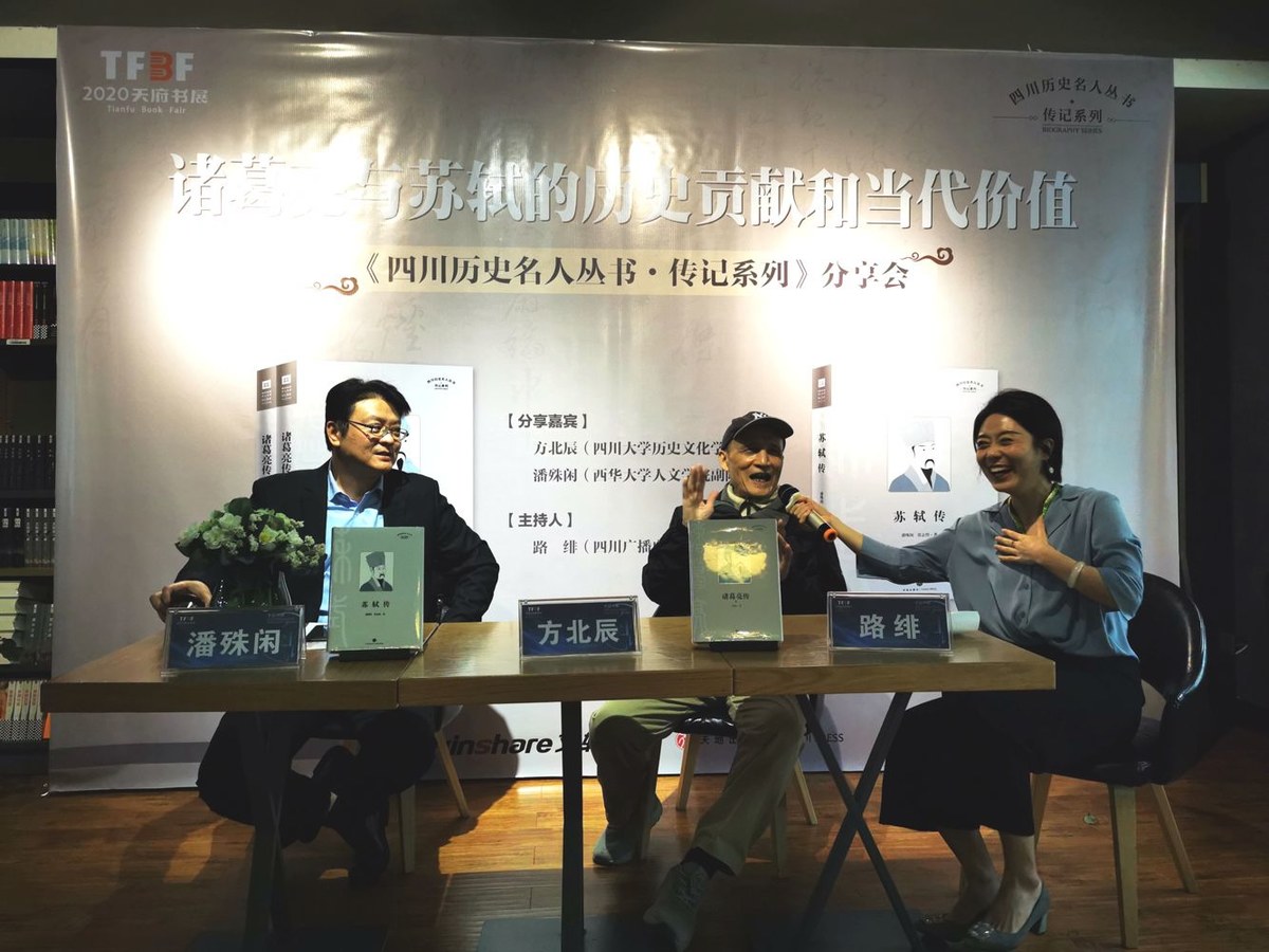 10月18日,由新华文轩出版传媒股份有限公司主办、天地出版社承办的“诸葛亮与苏轼的历史贡献和当代价值——《四川历史名人丛书·传记系列》分享会”在西南书城举行。作为2020天府书展的重点活动,此次分享会邀请到了《四川历史名人丛书·传记系列》中《诸葛亮传》的作者方北辰、《苏轼传》作者之一潘殊闲。两位专家通过对谈的方式,带领读者走近真实鲜活的历史,挖掘和讲述诸葛亮和苏轼的历史贡献和当代价值。