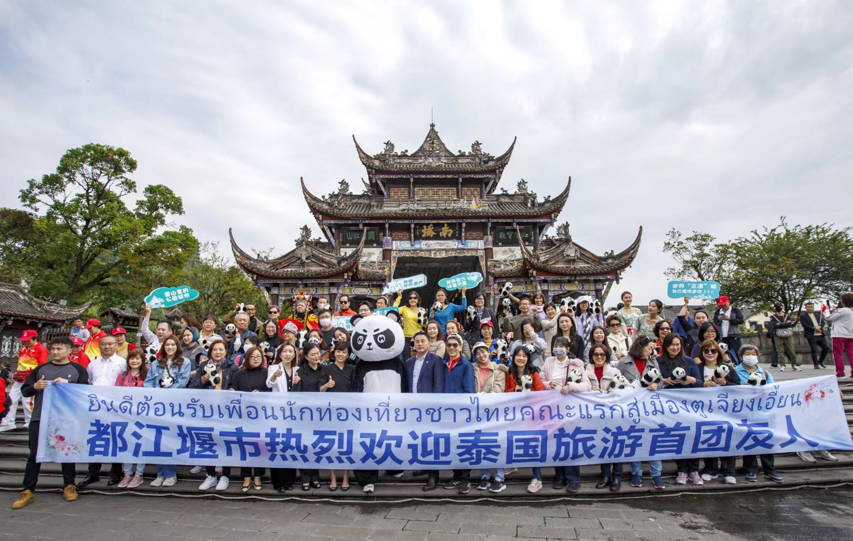 4月14日,都江堰市在南桥广场为该旅游团举行了简短热情的欢迎仪式。接下来,这些泰国游客将先后到都江堰景区、熊猫乐园、仰天窝广场自拍熊猫等景区景点深度体验旅游,感受“三遗之城”的秀丽风光和人文风情。