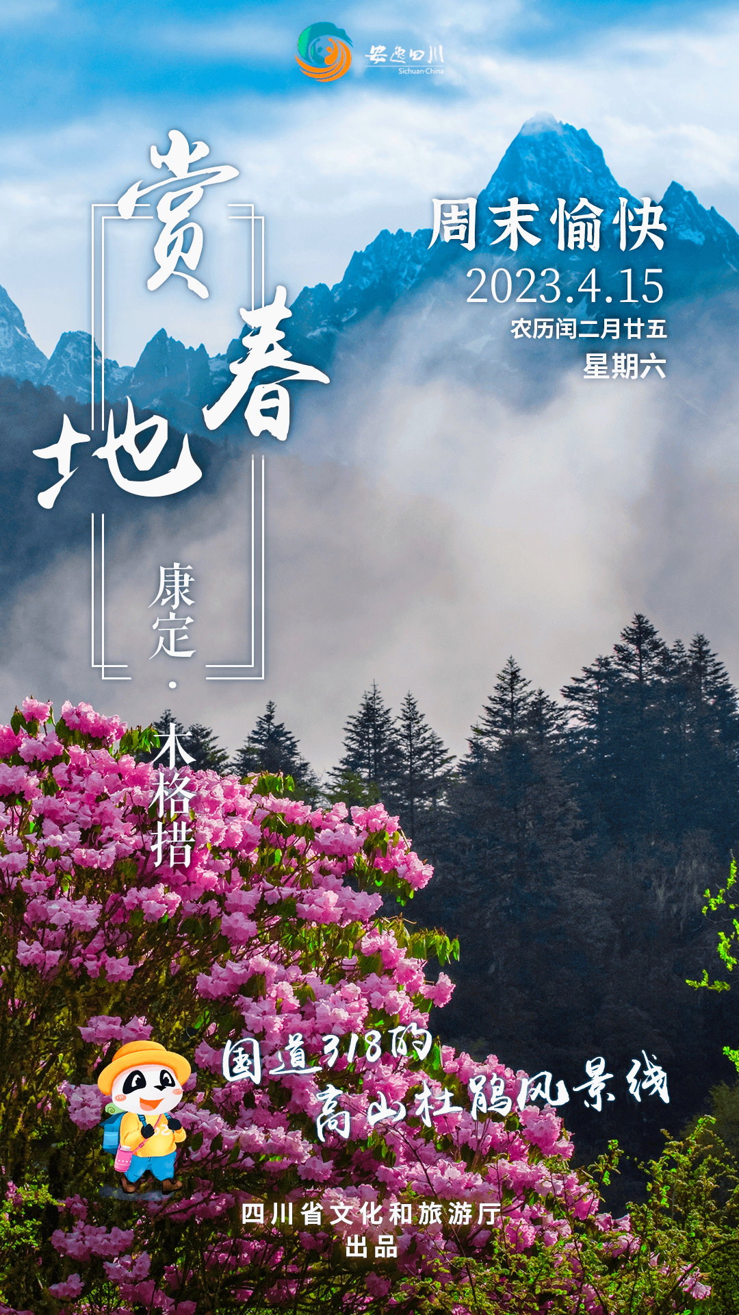 4月15日,星期六,周末愉快。今天安逸四川日历海报带大家走进甘孜州康定市木格措景区,一赏国道318的高山杜鹃风景线。