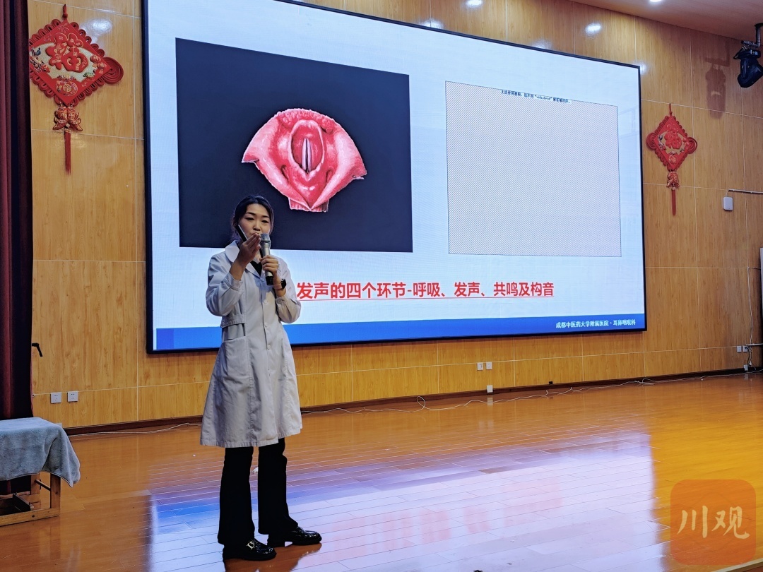 成都中医药大学附属医院/四川省中医医院主治医师梁方琪以《学生如何护嗓爱嗓?》为题,从嗓音产生原理、嗓音疾病的临床表现、如何保护我们的嗓子、如何进行嗓音保健等四个方面向老师和同学们进行了讲解,并通过新媒体课件、现场示范与实践相结合的形式,为大家详细讲解了腹式呼吸训练、放松练习、声带打嘟及吹管练习、共鸣练习等内容。