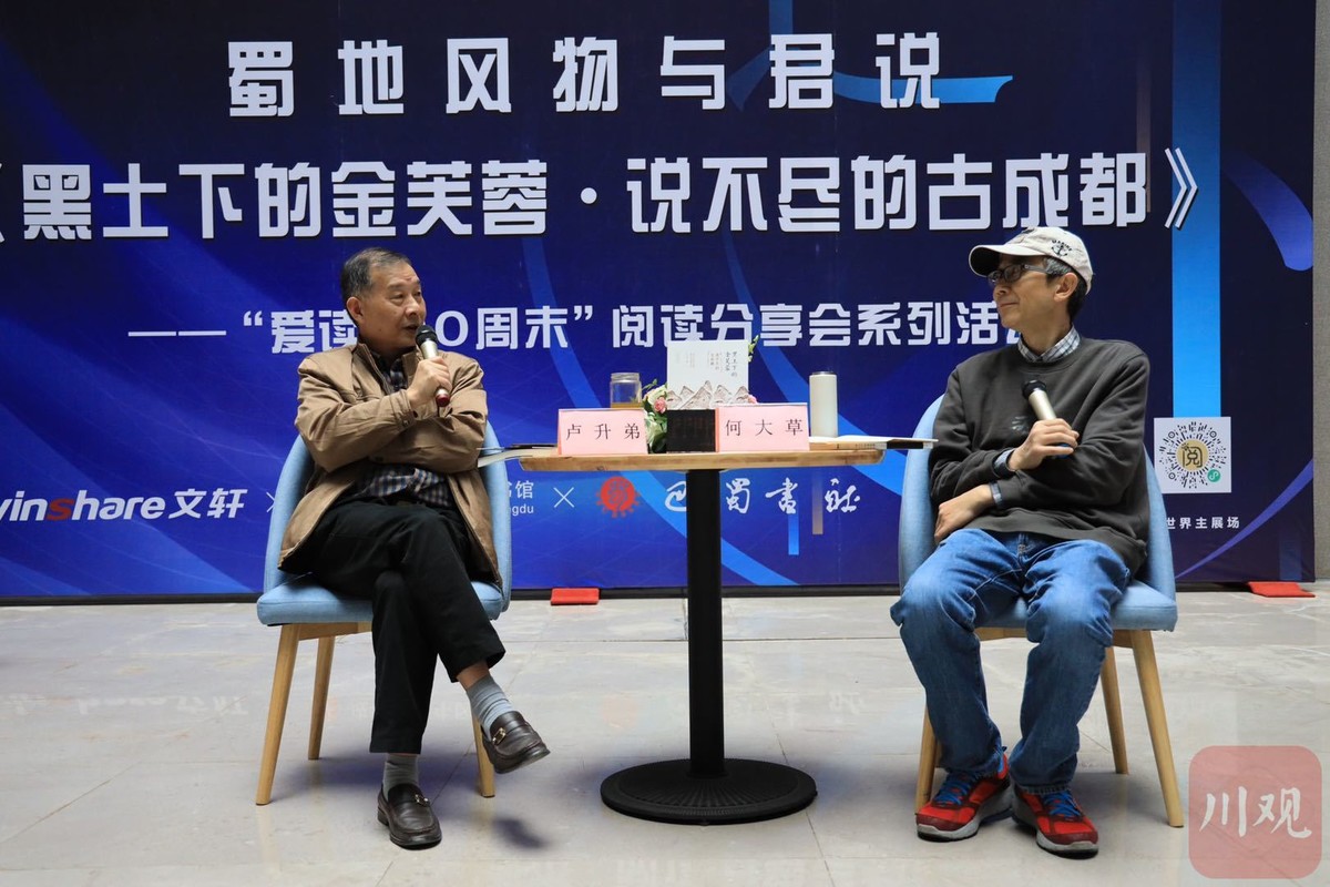 10月18日下午,由新华文轩出版传媒股份有限公司主办,巴蜀书社、成都金牛区图书馆承办,成都博物馆支持的“蜀地风物与君说——《黑土下的金芙蓉——说不尽的古成都》新书分享会”在金牛区图书馆举行。分享会上,著名作家何大草先生和本书作者、成都博物馆资深保管和研究员卢升弟就古成都历史风貌展开了一场妙趣横生的对话。