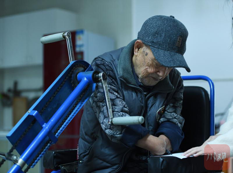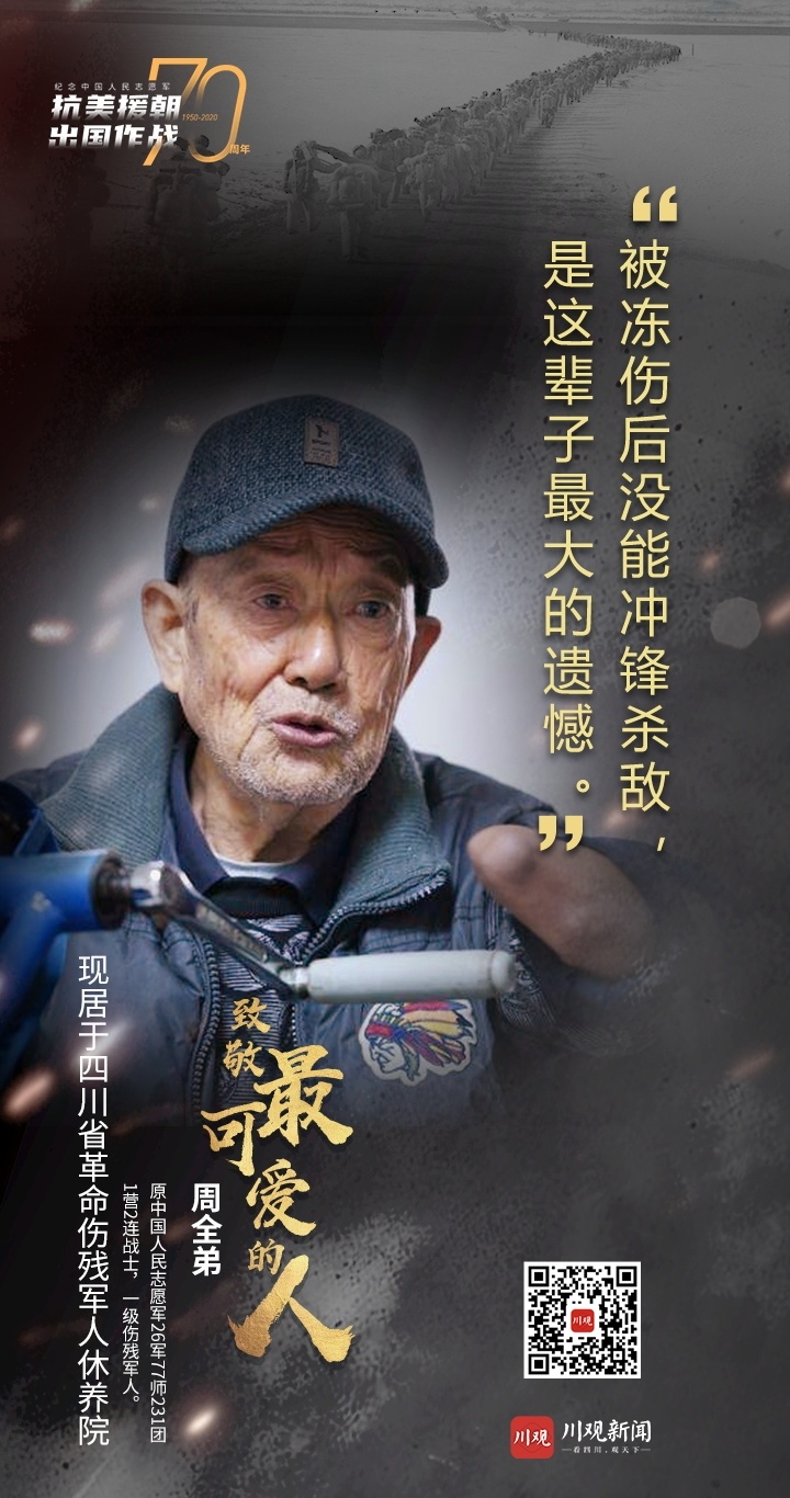 “这辈子,我最大的遗憾就是,被冻伤后,我没能和战友们肩并肩冲锋杀敌。”10月18日,在位于成都市新都区的四川省革命伤残军人休养院荣军楼6楼的一户“光荣之家”里,坐在手摇三轮车里的86岁老人周全弟回忆起70年前,抗美援朝入朝作战的经历,老人坚定地说,对在战场上受伤他并不后悔,唯一的遗憾是潜伏了三天三夜,没有亲手杀敌,没有完成祖国交给的任务。