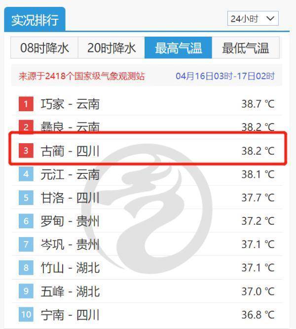 高温冠军,依旧是大家最熟悉的“火炉”古蔺。4月16日,古蔺气温直接飙升到38.2℃。