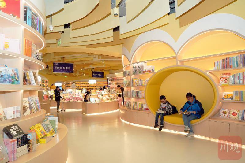 书店内,如彩虹般弯曲延展的撞色吊顶、圆弧形展台及座椅、拱形门廊、如宝石般椭圆形巨大装饰物……随处可见的是“圆形”元素。文轩亲子书店商品主管周婷向记者揭秘了这个容易被读者忽视的“细节”。“这些精妙的设计,均出自香港设计师潘鸿彬之手。”以“圆”为整个书店的设计结构,主要出于两方面原因,一是圆形象征着神秘且更加柔和,更能使小朋友在书店内放松下来,并对周围一切产生兴趣。二是不同于其他图形有尖锐的棱角,圆形一定程度上使小朋友在走动过程中不易发生磕碰,这也更好的契合了书店“亲子”的主题。