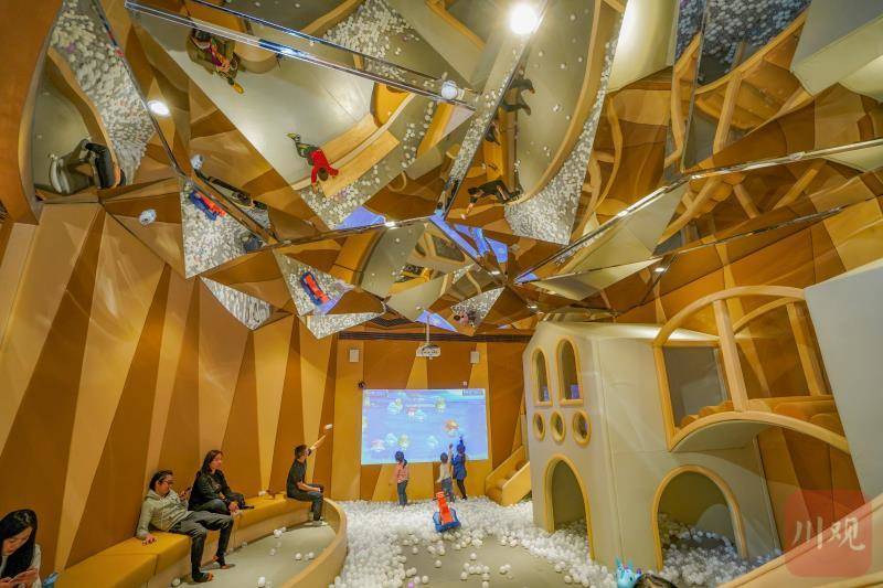 记者在书店中“漫步”过程中,也发现了诸多看起来普普通通,实则有“小心思”和“大奥秘”的设计。行经至儿童游乐园,天花板上数块由镜面拼接而成的不规则3D棱形装置吸引了记者的注意。向周婷打听一番后,才知道这看似不起眼的镜面装置,却别有用心的安装在了天花板上。“家长在休息区可以通过抬头看这些组装起的镜面,知道孩子现在在哪个区域玩耍以及在玩什么项目。”