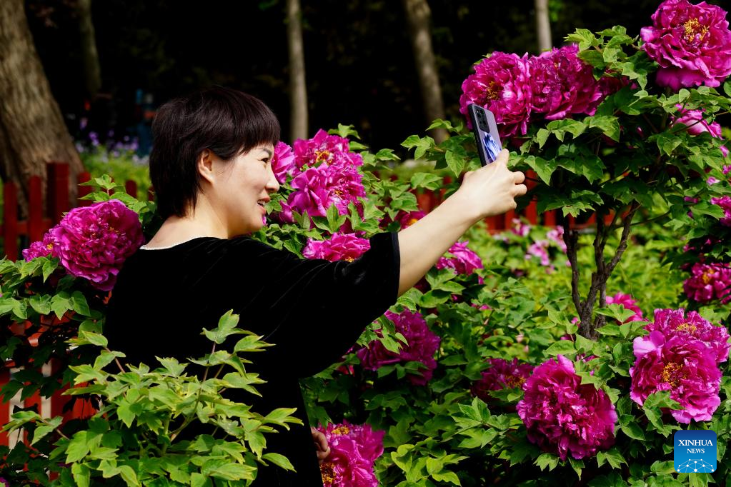 A tourist takes selfies at a peony garden during a local peony culture festival in Baixiang County, north China's Hebei Province, April 18, 2023. In recent years, the county has promoted the integrated development of peony industry with local tourism, health care, and cultural innovation to boost rural revitalization. (Xinhua/Mu Yu)