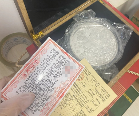 电话或短信推销之外,有的收藏品则是从看似正规的途径而来。林又峰的父亲,是听信了自称是某银行推销人员的推荐,而先后花费近四万元购买了多个“收藏品”。这其中,有名为“国家财富人民币套装”,购买价格为5950元;还有一个名为“世界银元”的收藏品,购买价格约8800元;此外,还包括一个纪念银砖,以及“传世珍宝精雕彩银版书画双绝”,价格为28800元。“那个推销员指导我父亲在银行App上操作购买的。”林又峰知道后,曾联系要求退货。经过一番周折,终于成功退掉了一个8000多元的“收藏品”,“再后来我们要求继续退,那个推销员的微信和电话都拉黑了老人,联系不上了。”