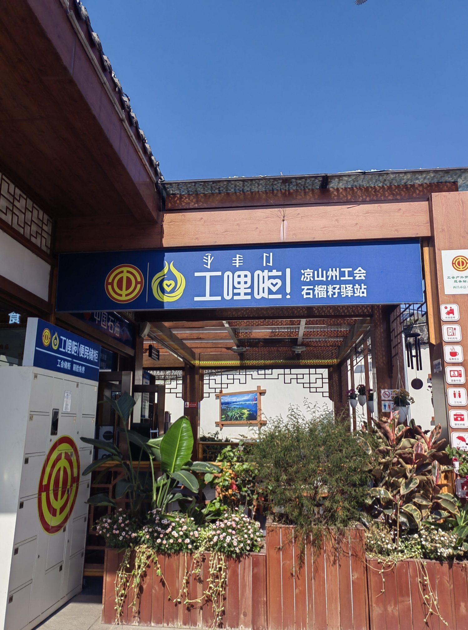 “工哩啦”驿站独具民族特色。“在装饰上,我们在建筑上方加了一圈彝族特有的图腾式花边图案,同时标识是由工会标识+‘石榴籽’的图像组成,也代表着各民族团结的精神、凝聚的力量。”王竹介绍,“我们希望广大户外工作者在工作累了的时候,可以进来坐一坐,休息一下‘充充电’,不仅体现工会驿站贴心的服务,更体现我们凉山人热情豪爽的待客之道。”