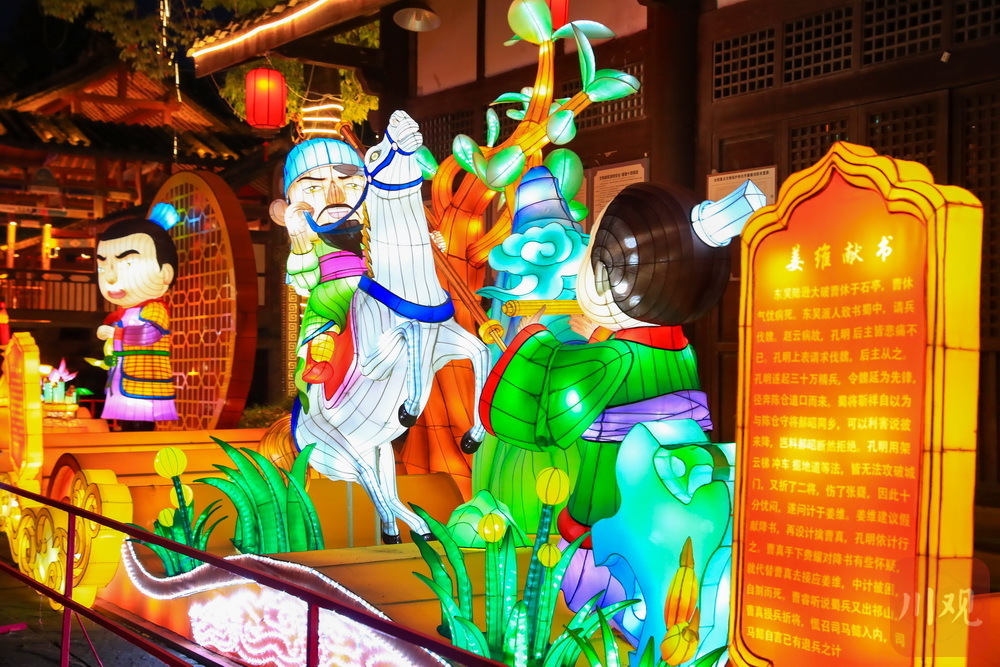“诸葛亮大开城门,自己则在城楼淡定弹琴,吓跑了司马懿的数万大军。”空城计、草船借箭……在灯组前,不少家长给孩子讲起了三国故事。芦山县古为青衣羌国,因是蜀汉大将姜维屯兵所筑,又称“姜城”,被誉为“汉代文物之乡”。此次灯会聚焦“三国”主题,以灯彩艺术的形式呈现三国历史故事,既有传统灯会的表达形式,也有现代光影科技的交互式体验。