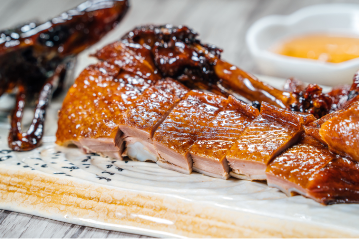 乐山人称卤鸭子,也称“嘉州甜皮鸭”。甜皮鸭改良自卤鸭,故也称甜皮卤鸭。甜皮鸭由民间发掘、改进,其卤水别具特色,具有色泽棕红、皮酥略甜、香气宜人,或脆甜,或肥厚,附以细嫩的里肉,嚼在口中,肉质细嫩,咸淡适中让人回味无穷。