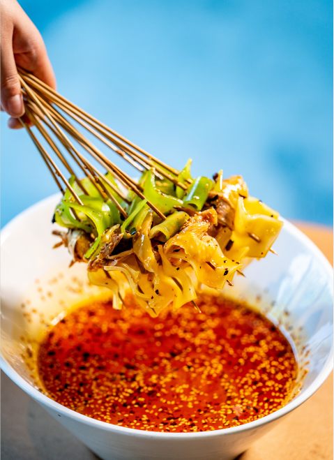 乐山的地方传统小吃,由各种蔬菜、肉食切成不规则的形状,再用做好的竹签把这些菜品串成一串一串,最后把它放入特制配方的锅里加工煮熟即可食用,其味道麻辣可调,回味悠长,且使用方便。
