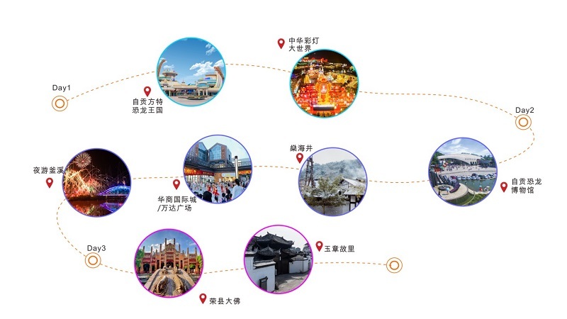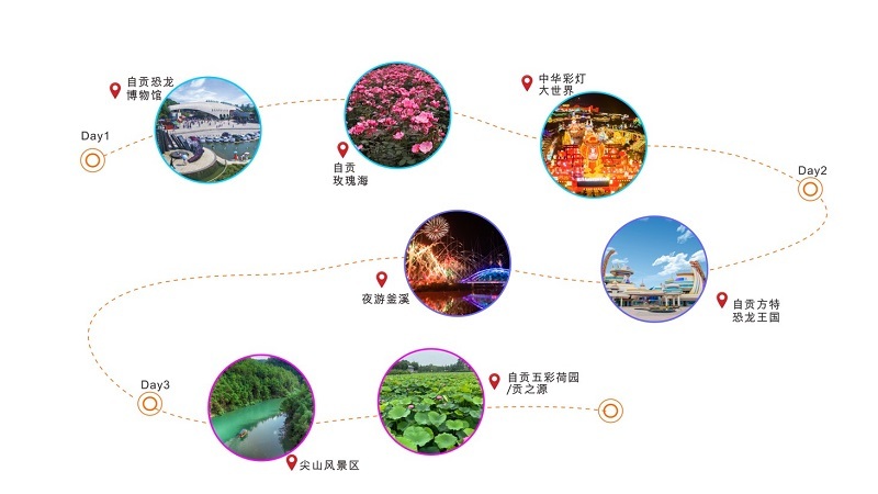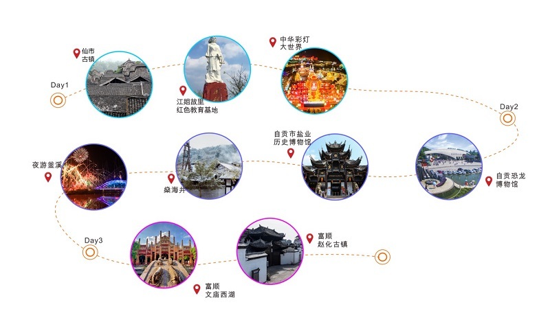 与此同时,开启自贡非遗传承之旅,在旅行中感受自贡井盐深钻汲制技艺、自贡灯会、自贡扎染、自贡龚扇等非遗项目的无穷魅力。