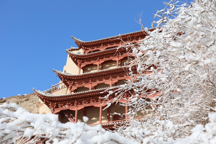 Photo taken on March 25, 2022 shows a view of the Mogao Grottoes, a world cultural heritage site, in Dunhuang, northwest China's Gansu Province. (Xinhua/Li Yuhui)