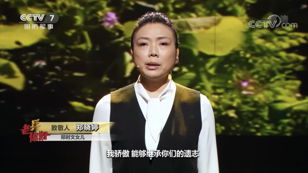 “我是一个小小的通讯员,一个学生兵。我的任务,送战地文书,搜集战地情报,写战地通讯。小笔杆子写得笨,但是要写,因为我们全军需要声音!祖国需要声音!”在央视演播厅,郑时文慷慨激昂。