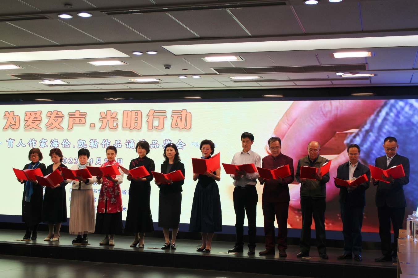 这一天,是4月23日,世界读书日。由四川省残疾人联合会指导,四川省图书馆和四川省盲人协会联合主办的“为爱发声 光明行动”盲人作家海伦·凯勒作品诵读品鉴会正在省图书馆举办。四川省图书馆阅读推广大使董凡,四川省盲协主席吴军与成都蜀人吟叹诗社社长舒昭玉等汇聚于此,和视障读者一起,诵读经典,感受阅读之乐。