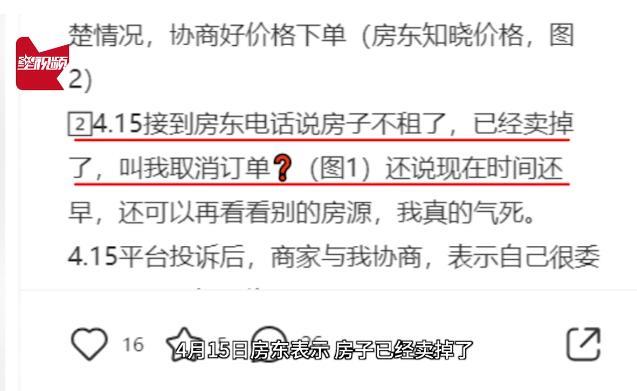网友苏女士称,4月初在某平台预订了房子,4月15日房东表示房子已经卖掉了,不租了并要求退单。在其他订房平台上,苏女士却发现了那套所谓卖出的房子,但是价格已经比原来涨了200多元。