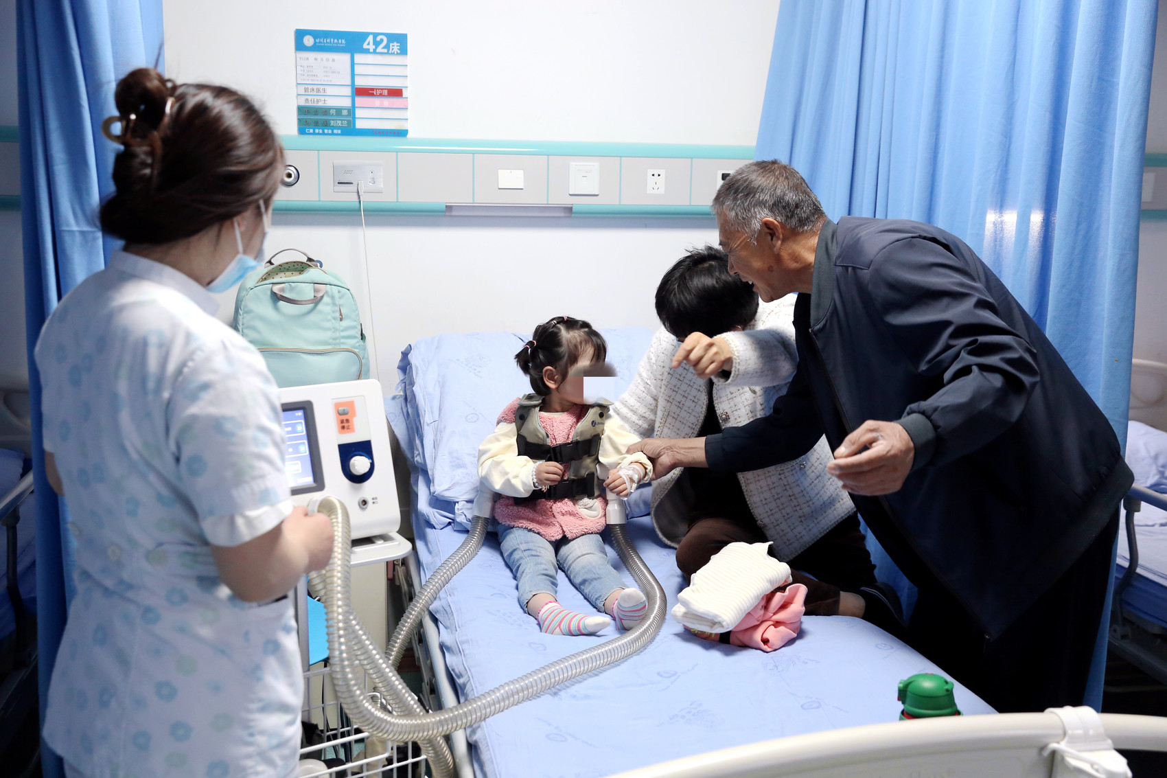 4月23日,四川省科学城医院医护人员正在为患儿用设备拍背。白桦拍摄。