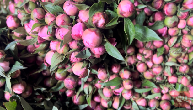 清洗花头、修剪花枝、按个头分级、保鲜、预冷……花香人间中药材芍药专业合作社分拣中心里,数十名工人忙着对即将入库的新摘鲜花进行处理,中心外,一辆满载包装盒的运输车已经早早等候。