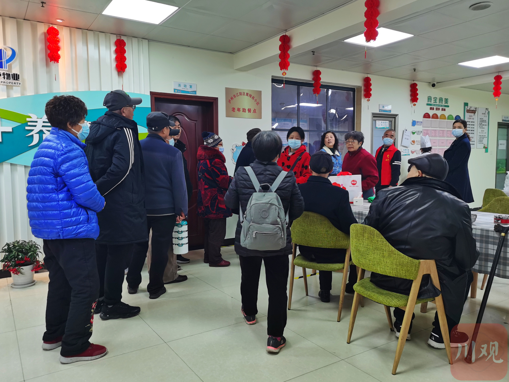 临近中午,泸州市江阳区沁园春小区居家养老服务中心的食堂里,6张蓝色桌子排开,不少老人已在此等餐,每天中午都有近40个老人在这里吃饭。