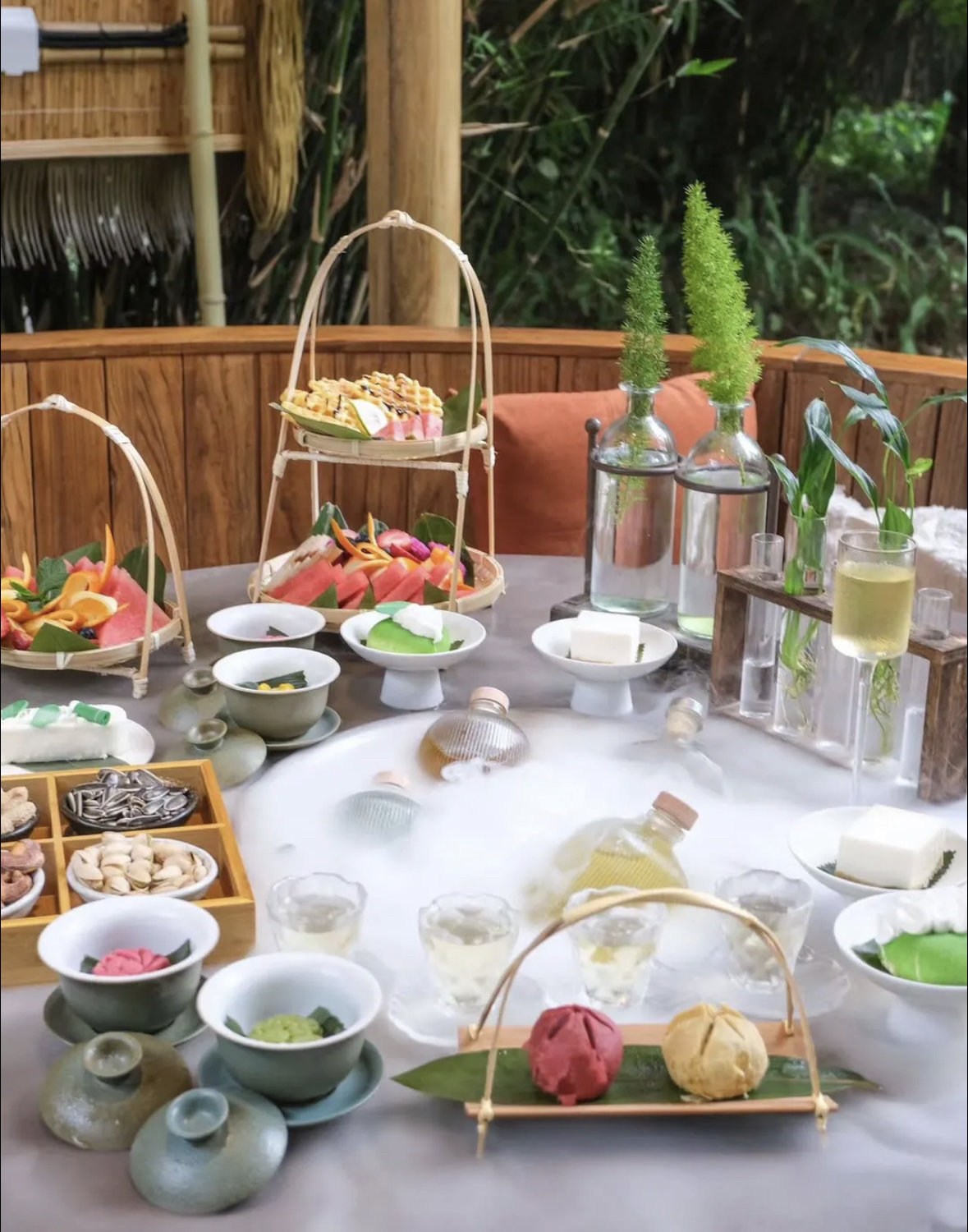 “围炉冰茶很出片,很有氛围感。”前来白鹭烟汀餐厅体验的消费者李晓媛说。记者在白鹭烟汀门店看到,木制或竹制的小圆桌、透明的玻璃容器、形状各异的果篮或点心架,再配书法帘幔、或者花花草草、小溪流水,场景十分唯美。