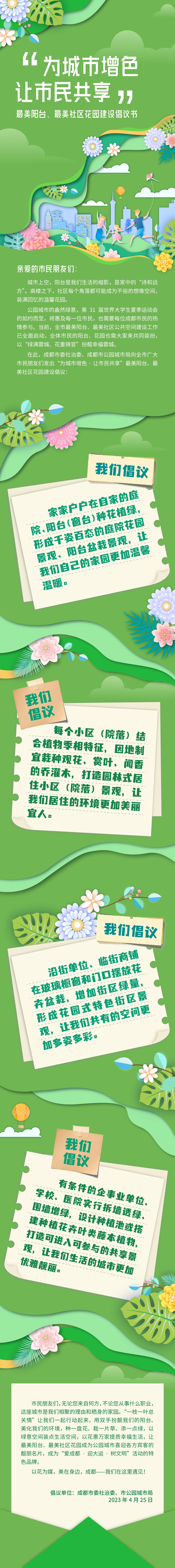 4月25日,“迎大运·遇见最美成都”2023年“遇见最美阳台”暨“遇见最美社区花园”创建活动启动,成都市委社治委、市公园城市局共同发出倡议,号召市民、商家、单位等各类群体积极参与最美阳台、最美社区花园建设。