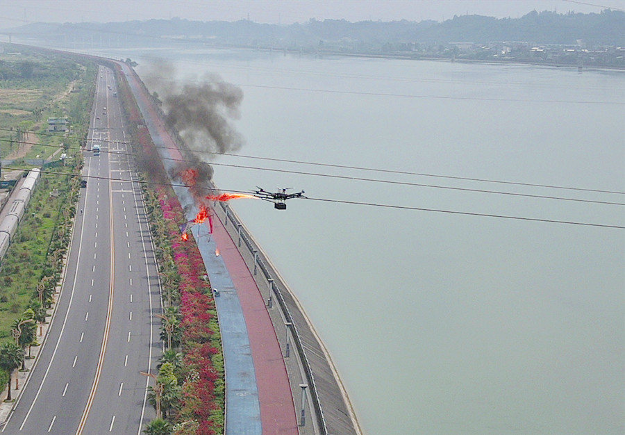 4月25日,国网乐山市沙湾供电公司运用一架搭载火焰喷射装置的小型无人机,悬停喷火,精准清除沙湾区一处高压输电线路上的两只风筝,有效保障了电网安全。