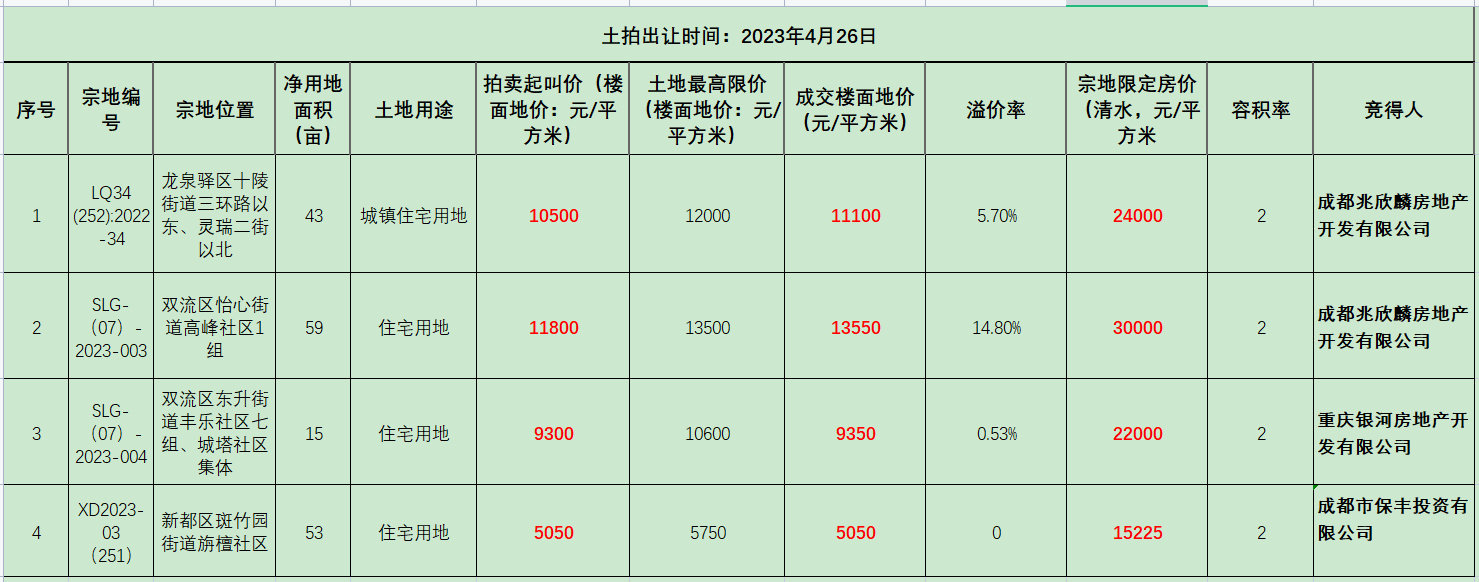 4月26日上午,来自成都近郊(二圈层)的4宗涉宅用地拍卖,其中双流区2宗,龙泉驿区和新都区各1宗,合计出让面积约170亩,拍卖方式依然是“限房价、定品质、竞地价”。最终4宗地全部成交,其中1宗地熔断后进入抽签环节,2宗地溢价成交,1宗地底价成交。