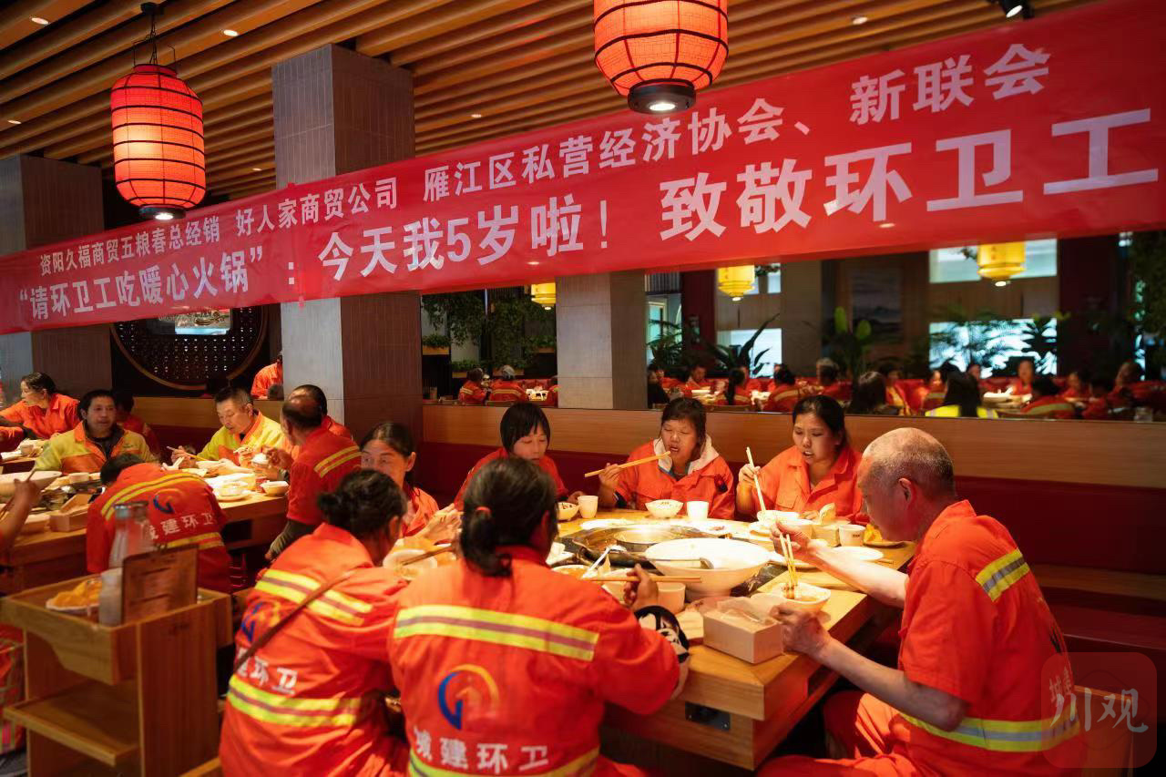 “吃火锅哟!”4月26日中午,位于资阳市雁江区雁城路的一家火锅店,被身着橙色工作服的环卫工人“包场”。在“五一”劳动节即将来临之际,4月26日及27日中午,由资阳市民政局等部门举办的“请环卫工吃暖心火锅”慈善活动在当地七家火锅店火热进行,为资阳城区2099名一线环卫工人煮上一顿美味的火锅。